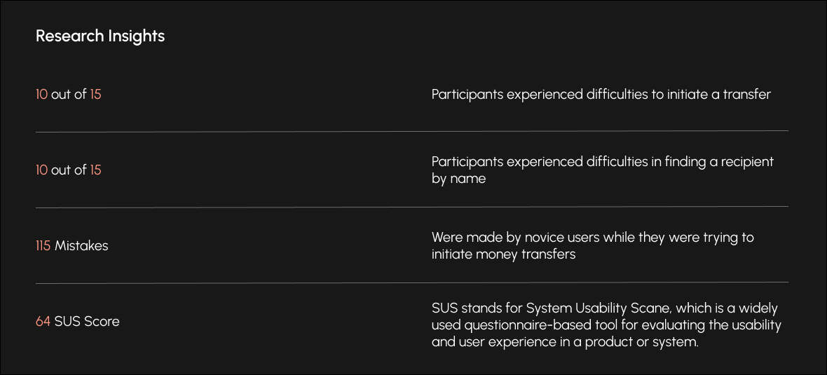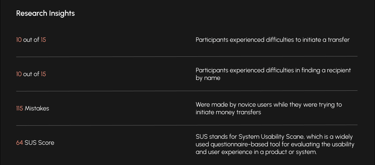 I did moderated usability testing with 15 participants (ages 25–55, mixed financial backgrounds). In the study i focused on the question "how can we evaluate on the efficiency on money transfers on the mobile application of the bank?