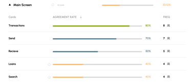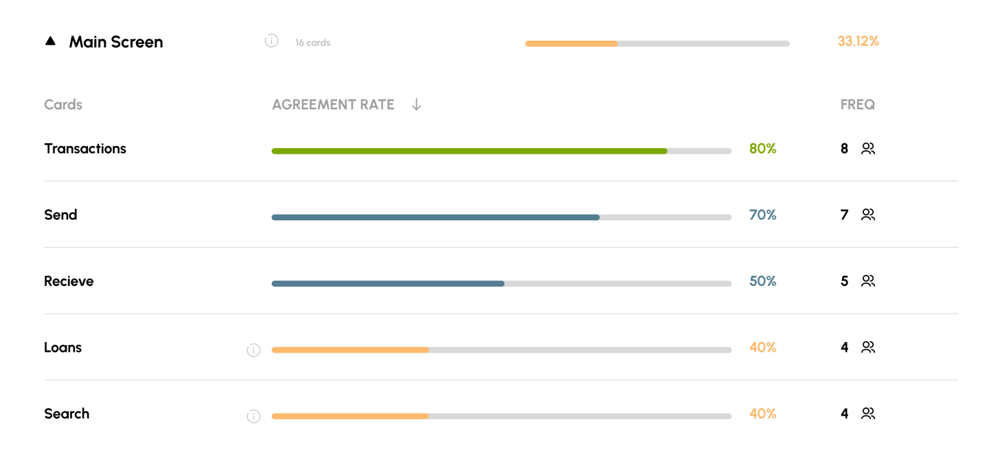 To assess and enhance the app's information architecture, I used the Card Sorting method conducted within the Maze tool. I successfully recruited a group of 15 participants for the testing. The findings indicated that the current information architecture generally aligns with user expectations, though with some recommended additions and prioritizations.