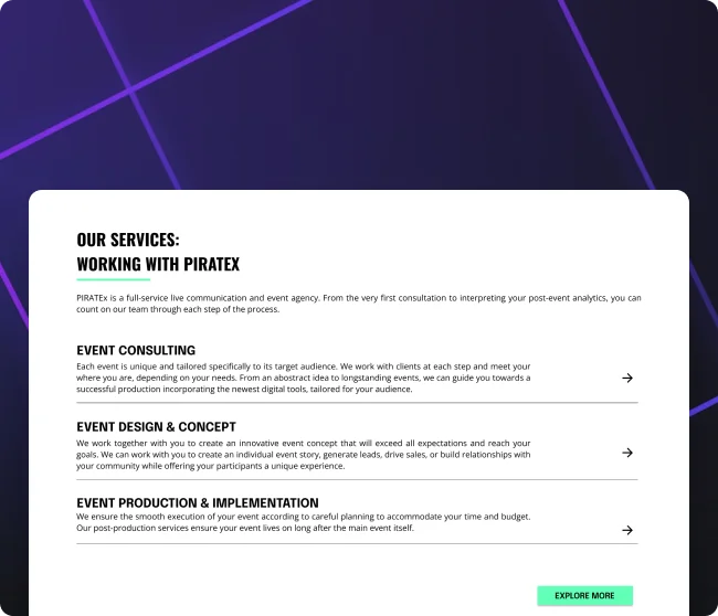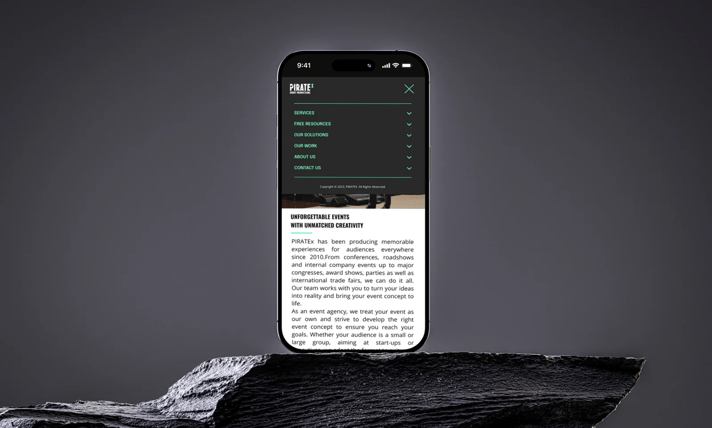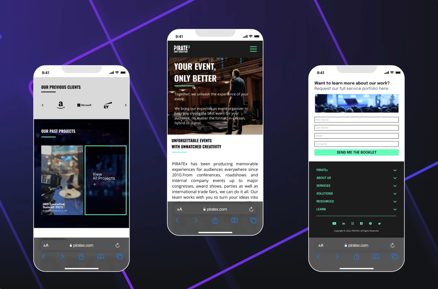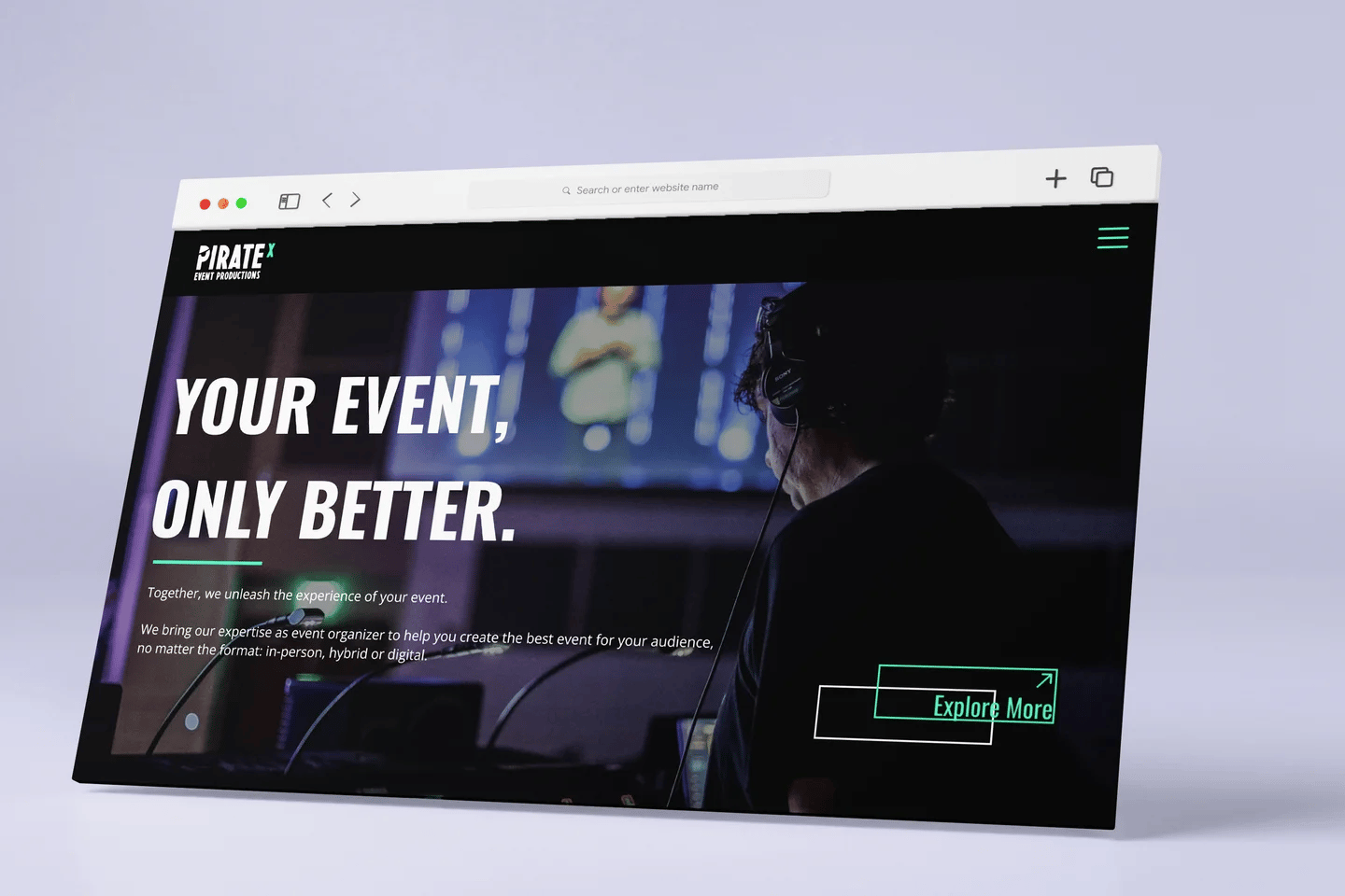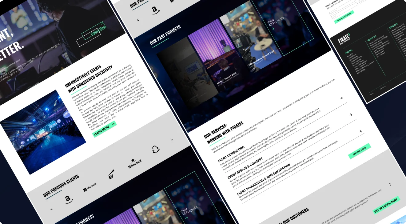 Additionally, the site needed to showcase PirateX’s diverse portfolio of events in a way that was visually engaging while remaining easy to explore for potential clients. Balancing the need for bold, creative visuals with practical functionality was key to delivering a successful redesign.