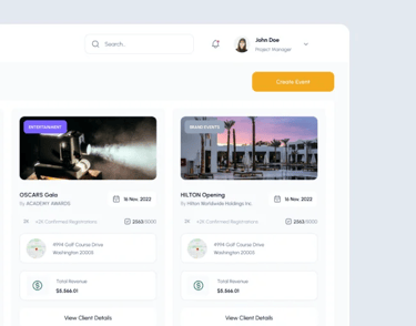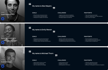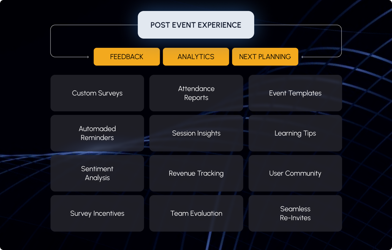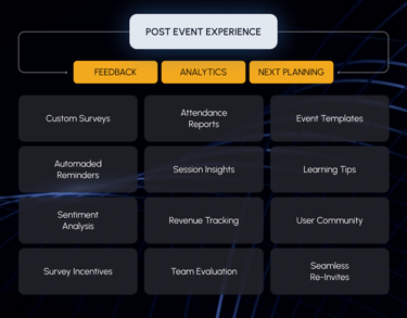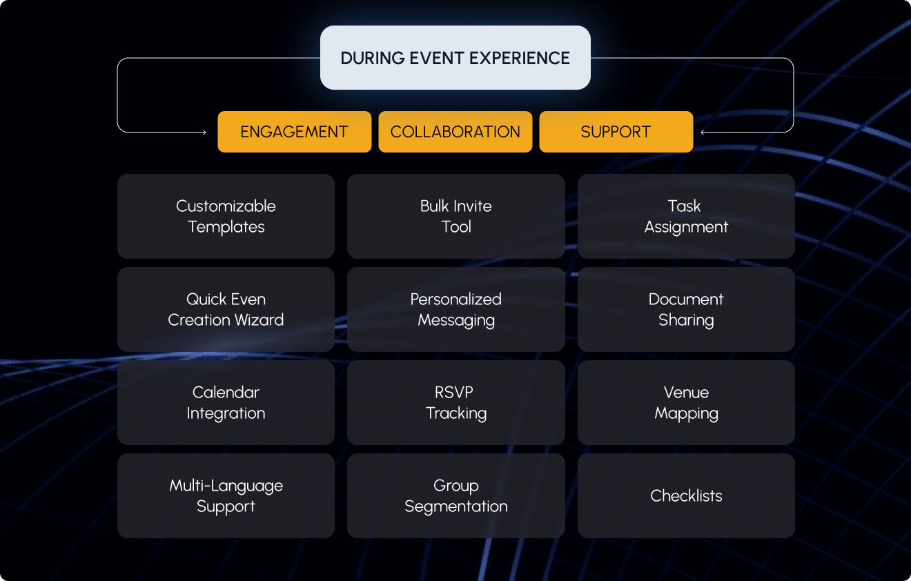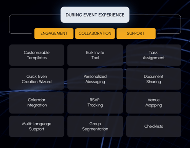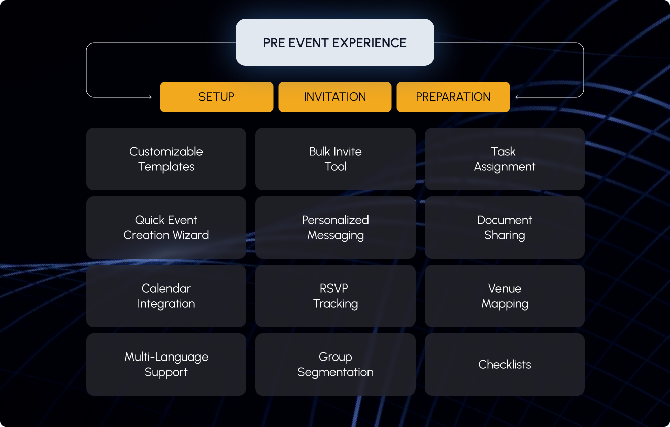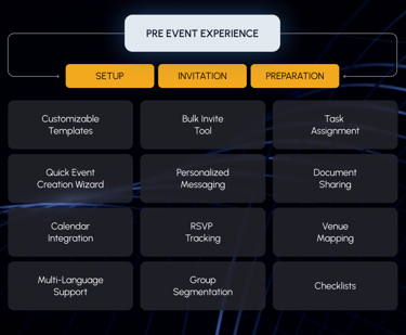 The customer experience is built around three core pillars: pre event planning, during event management, and post-event.